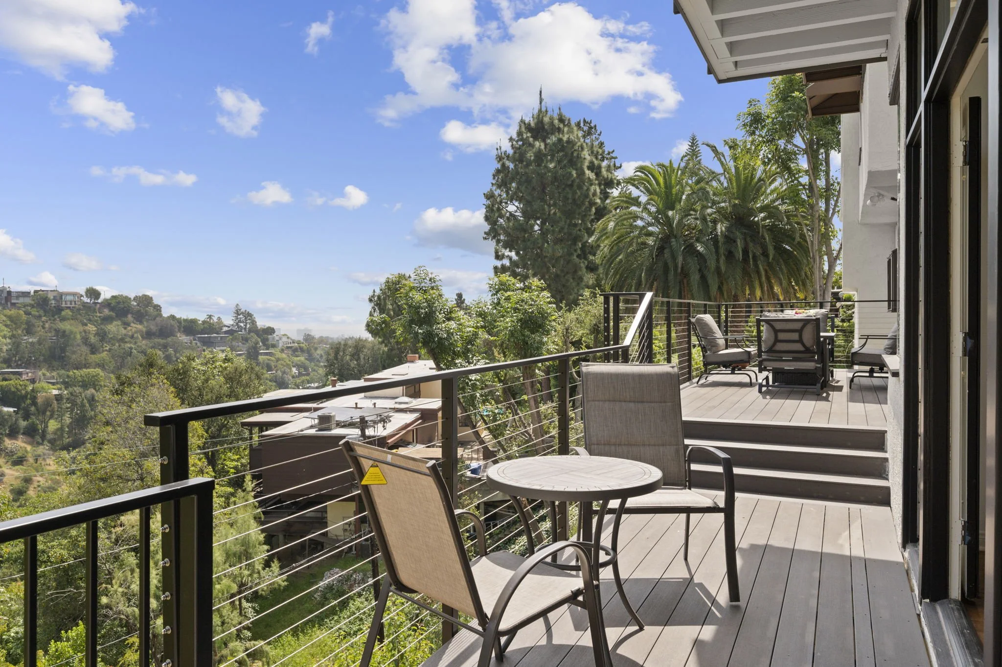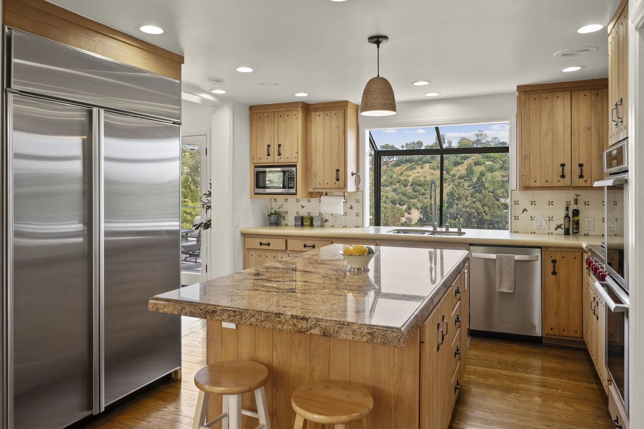 Discover a rare three-level Crestwood Hills residence within walking distance of Crestwood Park and Kenter Canyon School. A grand foyer leads to an elegant living area with sweeping, unobstructed canyon and city views from the interior through to the fully-refurbished decks. A dramatic high-ceiling living room—once host to recitals—features a fireplace, wet bar, and space for a grand piano. The dining area flows to a sunny kitchen with breakfast nook and outdoor dining. Upstairs, a generous landing connects three ensuite bedrooms to a large outdoor porch with beautiful canyon and peek ocean views. The primary suite hosts dual walk-ins, a fireplace, and private deck. The lower level offers a fourth ensuite bedroom, media/gym, and walk-in storage. The lovely home accommodates effortless entertaining with six off-street parallel spaces and 161 feet of level frontage parking. Schedule a private viewing to experience the views and possibilities firsthand.