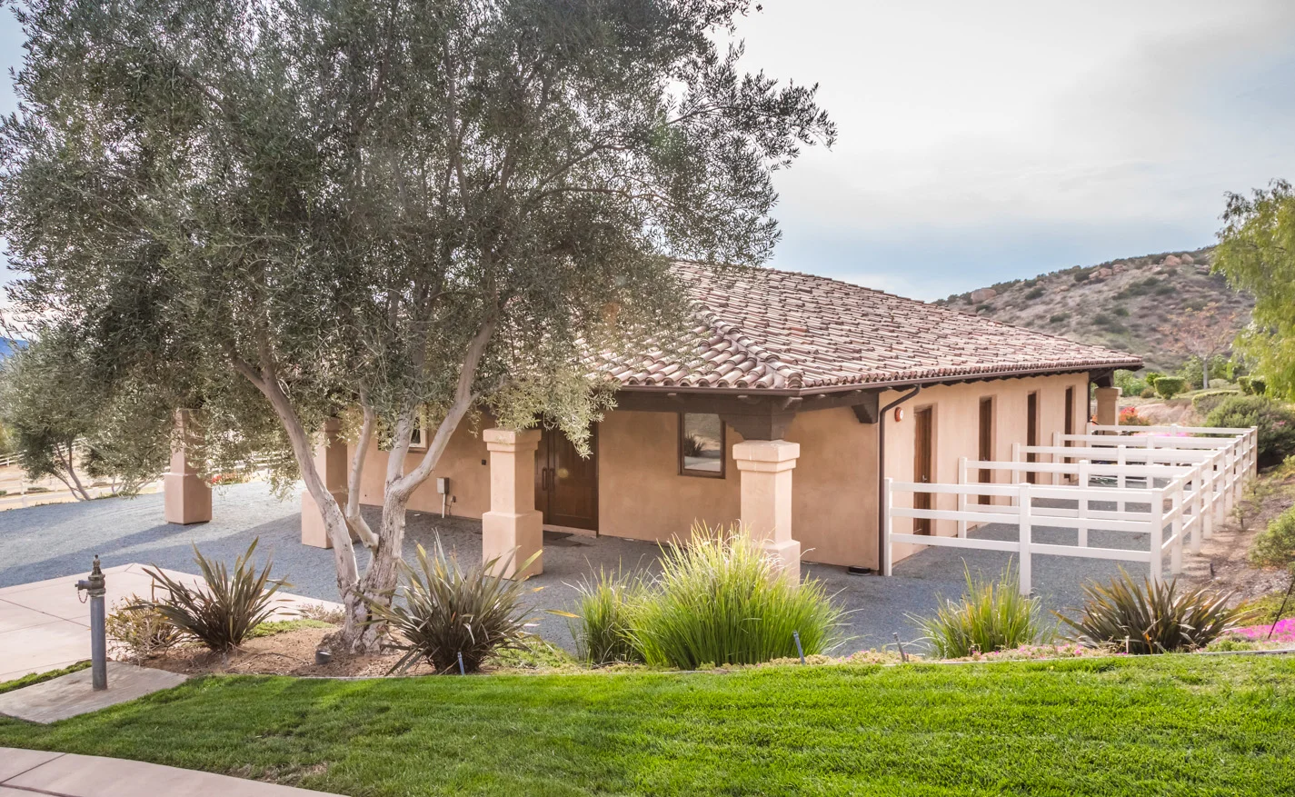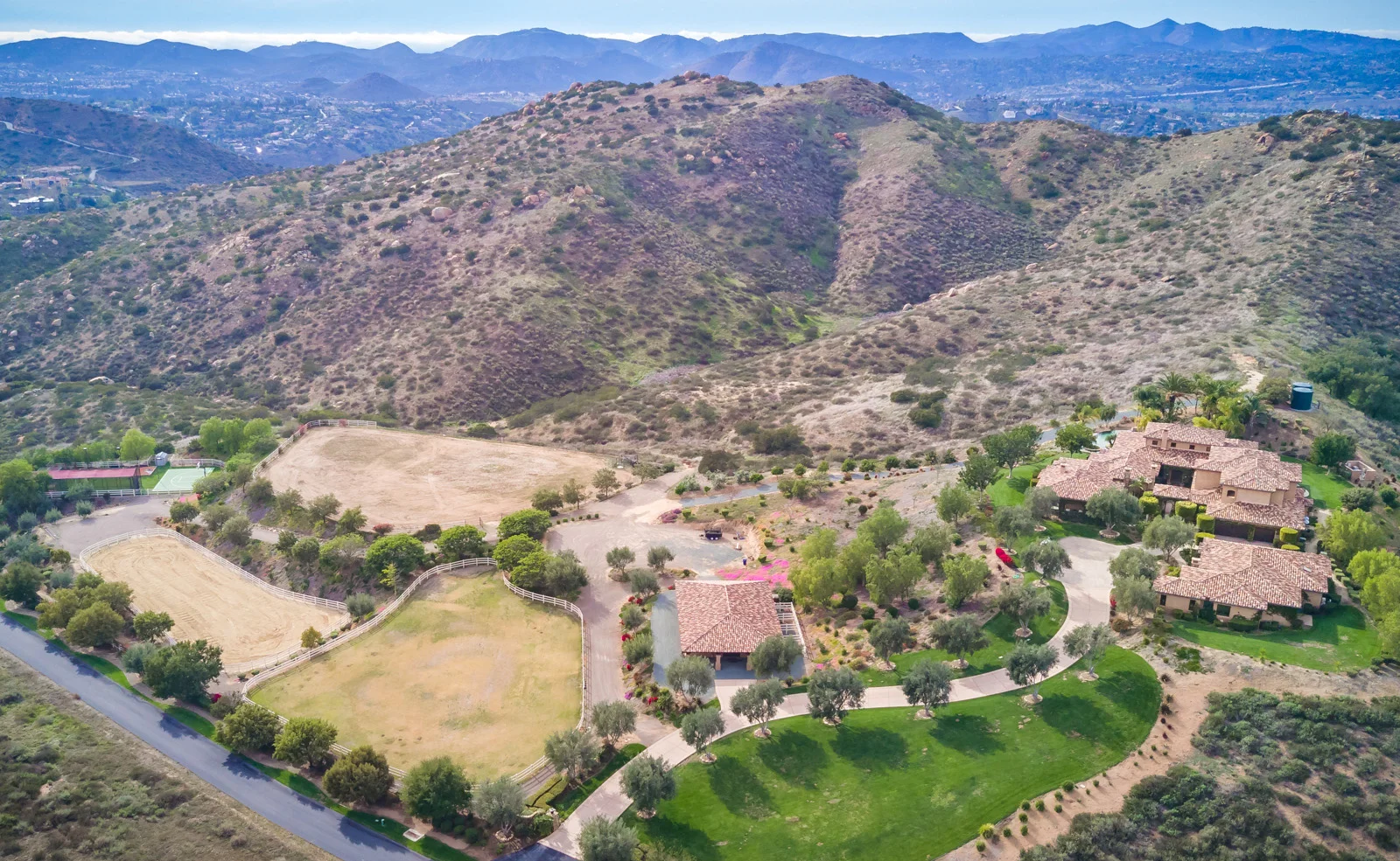 Entertainer's dream backyard with pool, spa, waterfall, loggia, stone patio and outdoor kitchen. Stunning neutral palette and sophisticated interiors to the stylish barn with 4 horse stalls, groom’s quarters, and riding pen, adjacent to the sport court, baseball cages, and space to add more outdoor offerings.