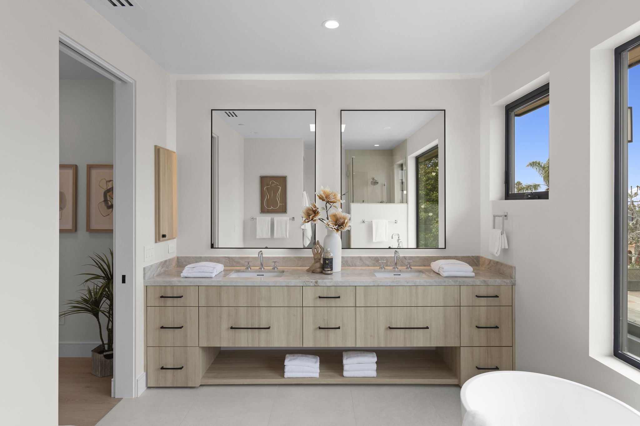 Exceptional new construction in Beach Barber Tract by renowned architect Mark Lyon features a stunning Main Residence and detached Guest House with private entrance. The sun-filled main home offers three ensuite bedrooms plus a fourth bedroom/office, wide-plank white oak floors, Fleetwood windows and sliders, Venetian plaster, stone accents, and designer tile throughout. A spacious kitchen with premier appliances opens to a covered patio with built-in BBQ, beverage fridge, and pass-through window—ideal for entertaining. The fully detached 1BD/1BA Guest House includes a full kitchen, stackable washer/dryer, and optional separate address. Perfectly positioned just steps to Windansea Beach and minutes to Bird Rock and The Village, this new coastal gem combines luxury, function, and style in one of La Jolla’s most sought-after locations.
