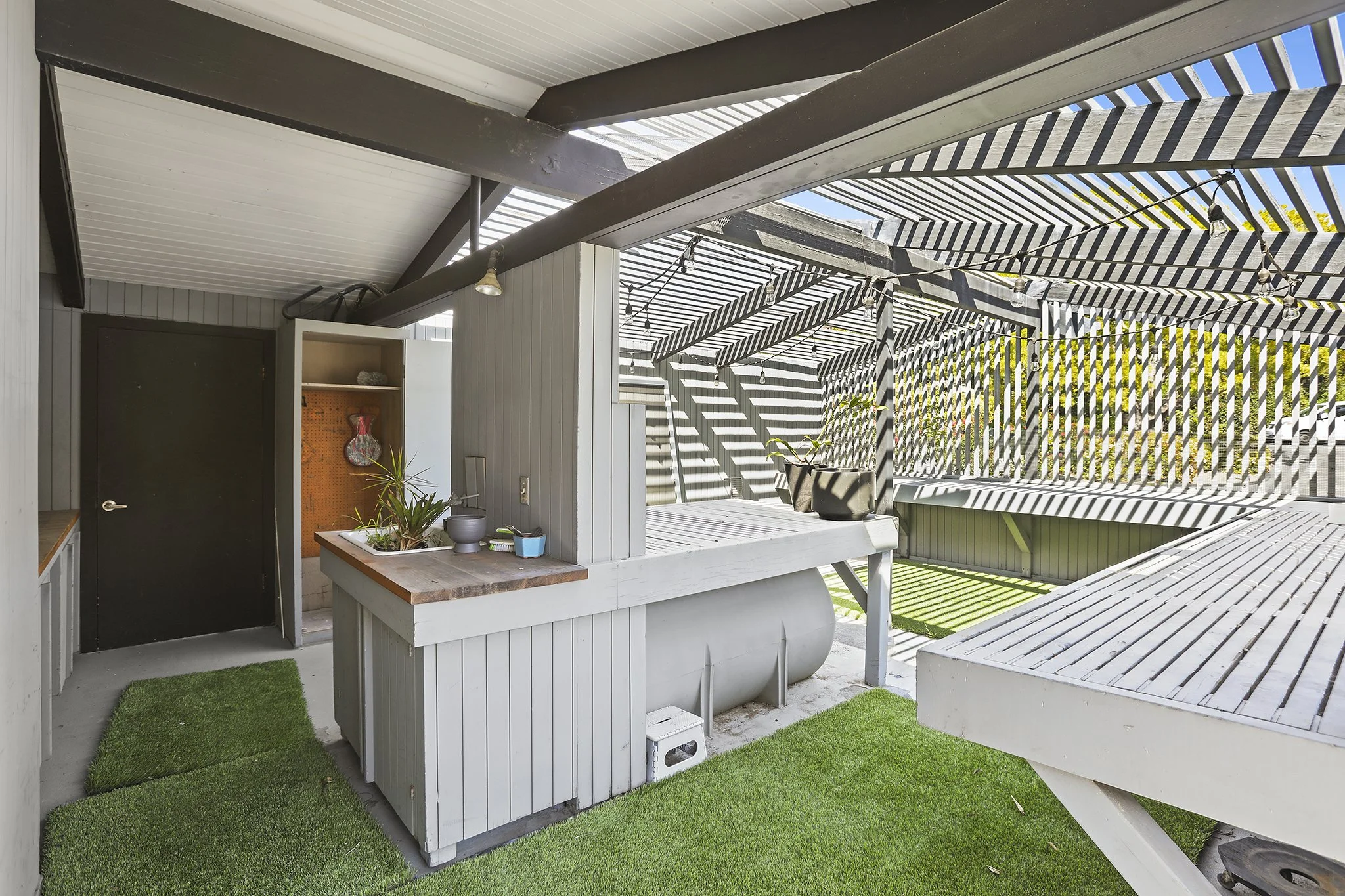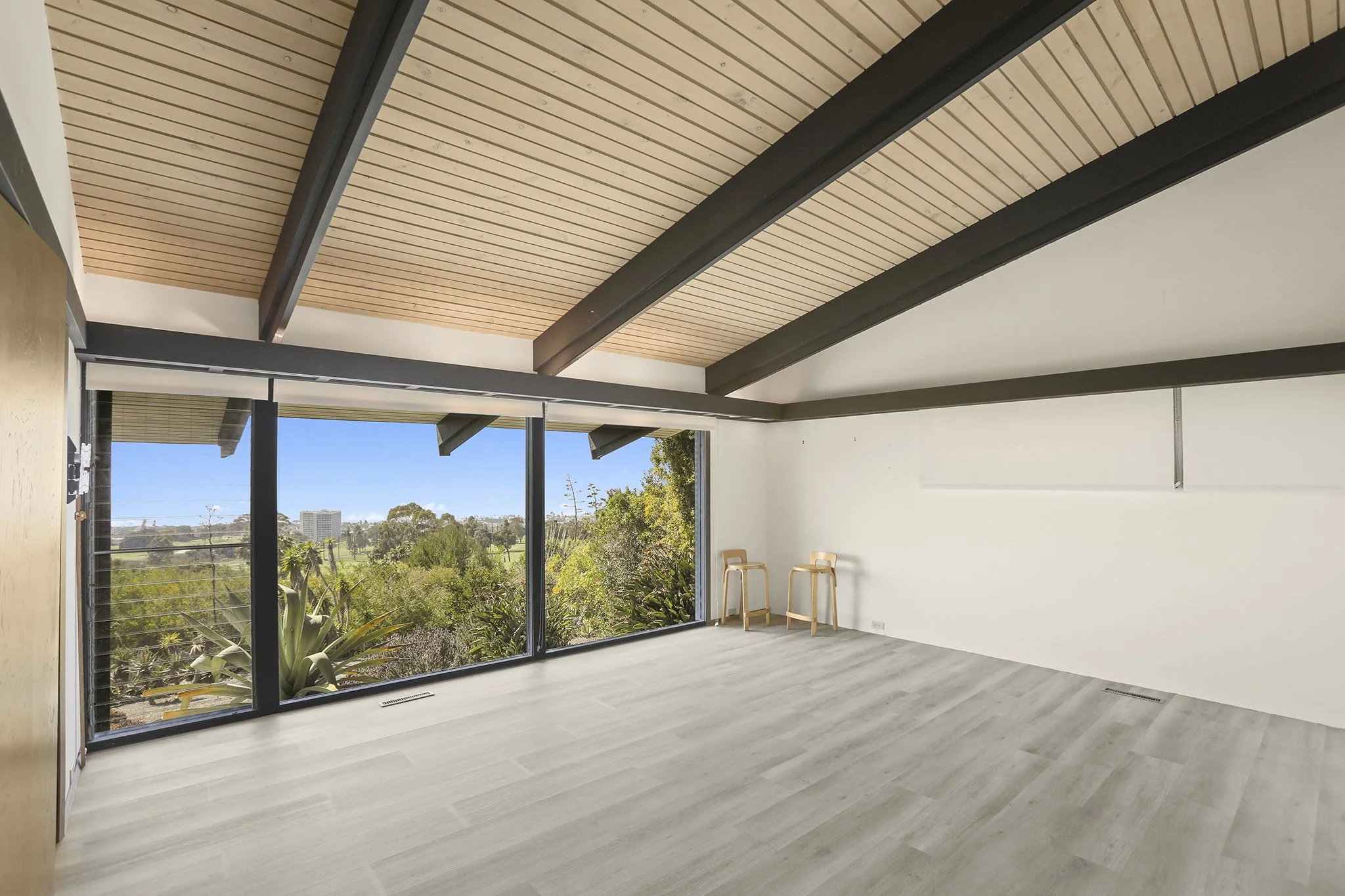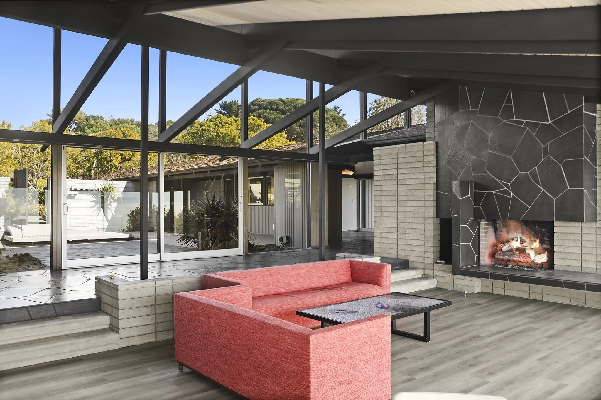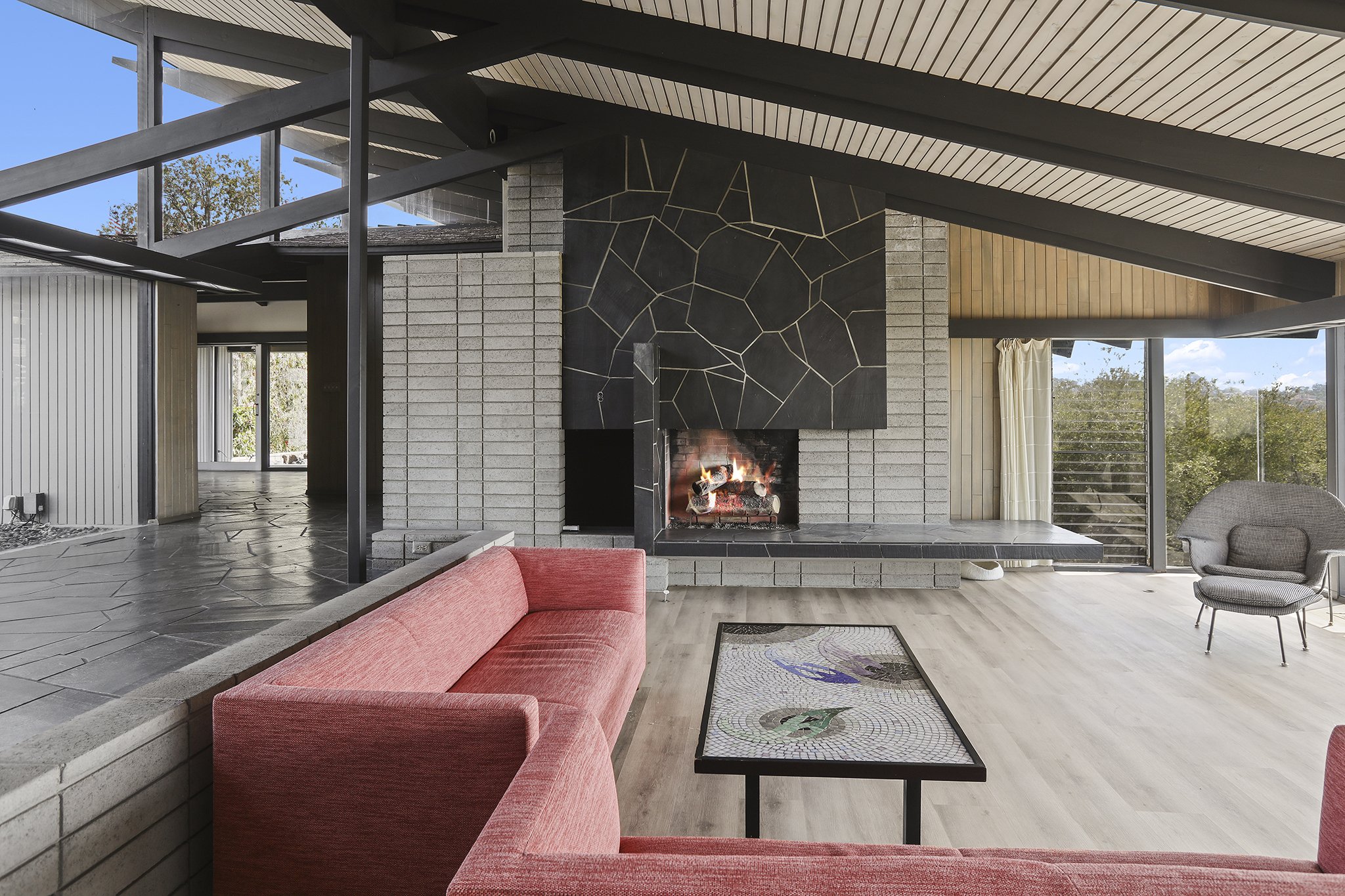 Sweeping, unobstructed panoramic ocean views beyond the rolling green hills of La Jolla Country Club are found at this mid-century modern masterpiece by noted architect Dale Naegle. Known as the Mills, Mansfield Residence, the Mills Act-qualified and designated historic home is organized into three distinct volumes arranged around a secluded courtyard. Jaw-dropping views are seen from the step-down living room and bedrooms, artfully featuring double-height windows, rafters, and additional hallmark elements of mid-century design. The primary bedroom retreat incorporates a private terrace. The front entry patio, with reflective pool and subtle landscaping, abuts an exterior, shaded garden room with space for respite and work. Thoughtfully-designed low maintenance pebbled gardens and intimate outdoor niches provide privacy and charm throughout the property.