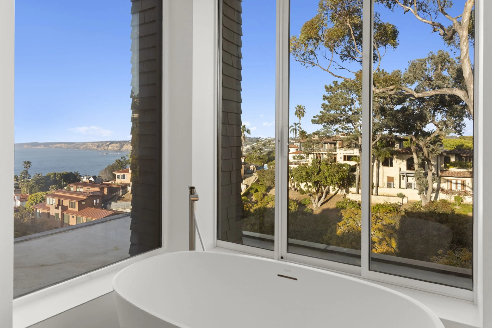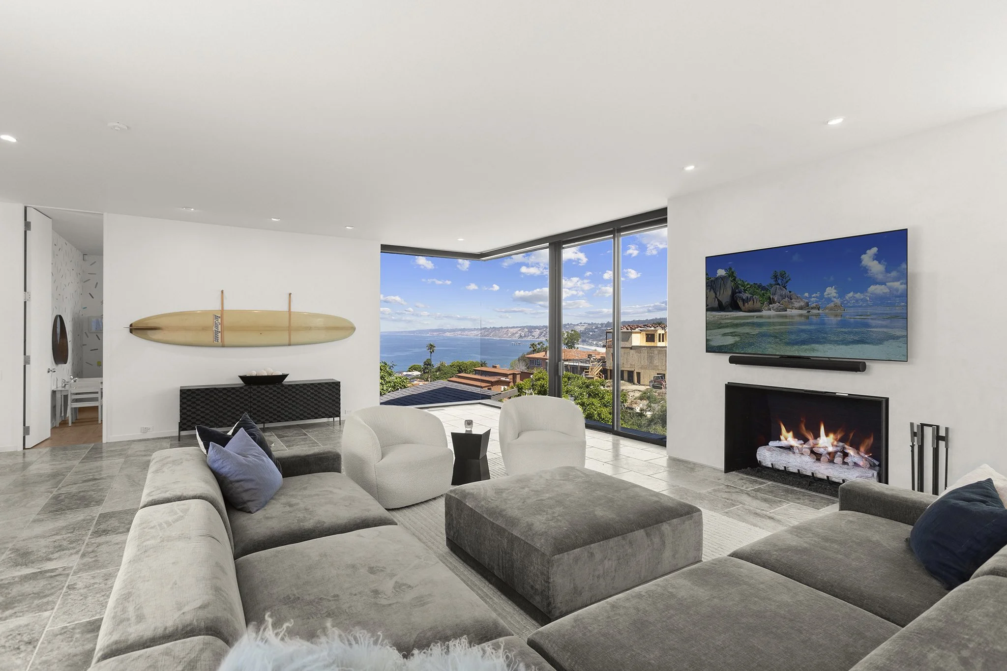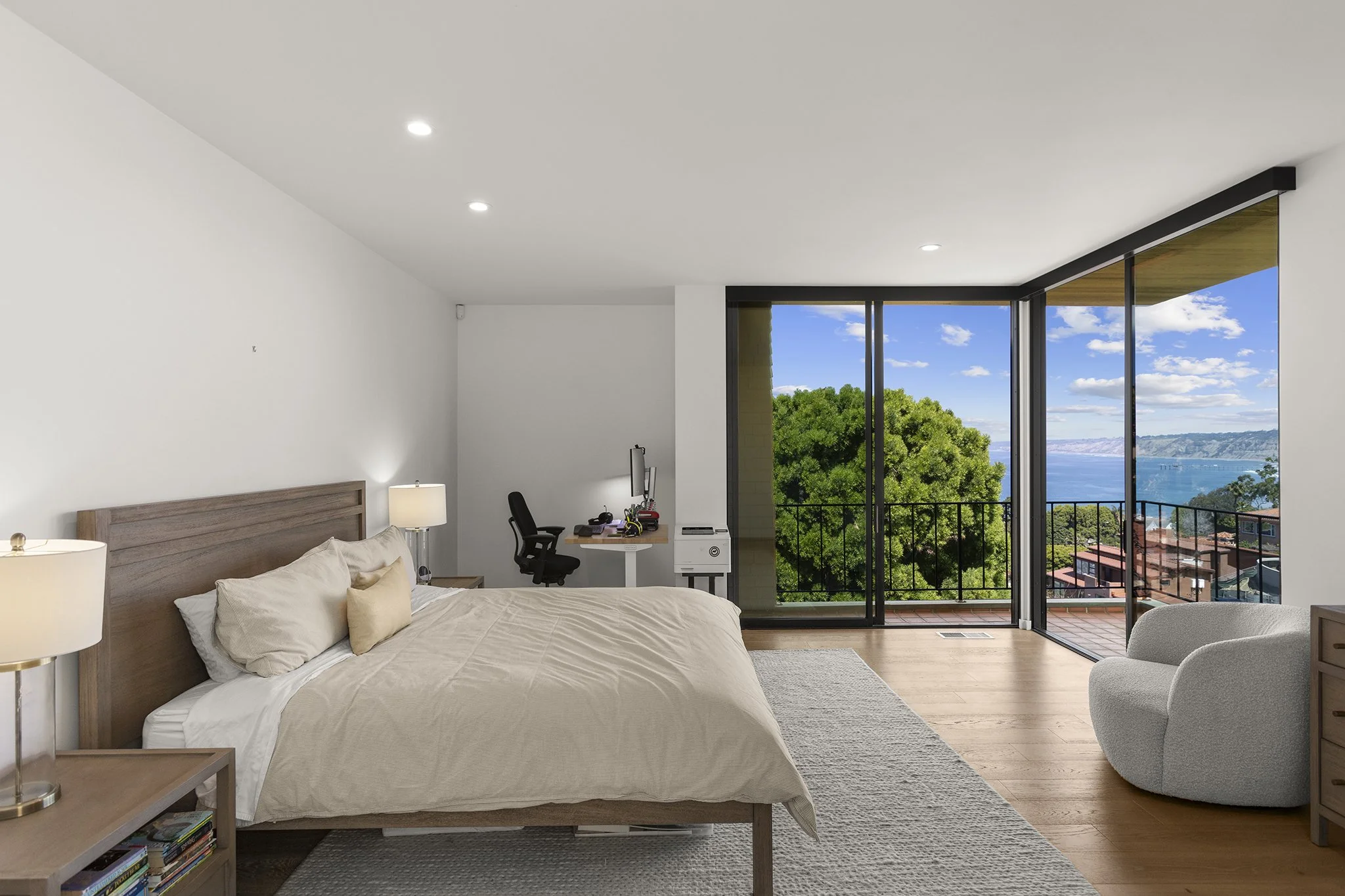 Wake up to sparkling Pacific and whitewater views in this Rod Youngson–designed treasure set on a private, highly sought-after street in La Jolla Hills. Offering effortless everyday luxury, the home features updated modern design while honoring its original architectural charm, striking a perfect balance between contemporary and timeless. Expansive windows in the main living area frame panoramic ocean and canyon scenes, filling the interior with natural light and emphasizing minimalist detailing and lofty ceiling heights. The open-plan layout leads straight to a secluded courtyard, extending the living space outdoors for seamless entertaining or quiet relaxation.